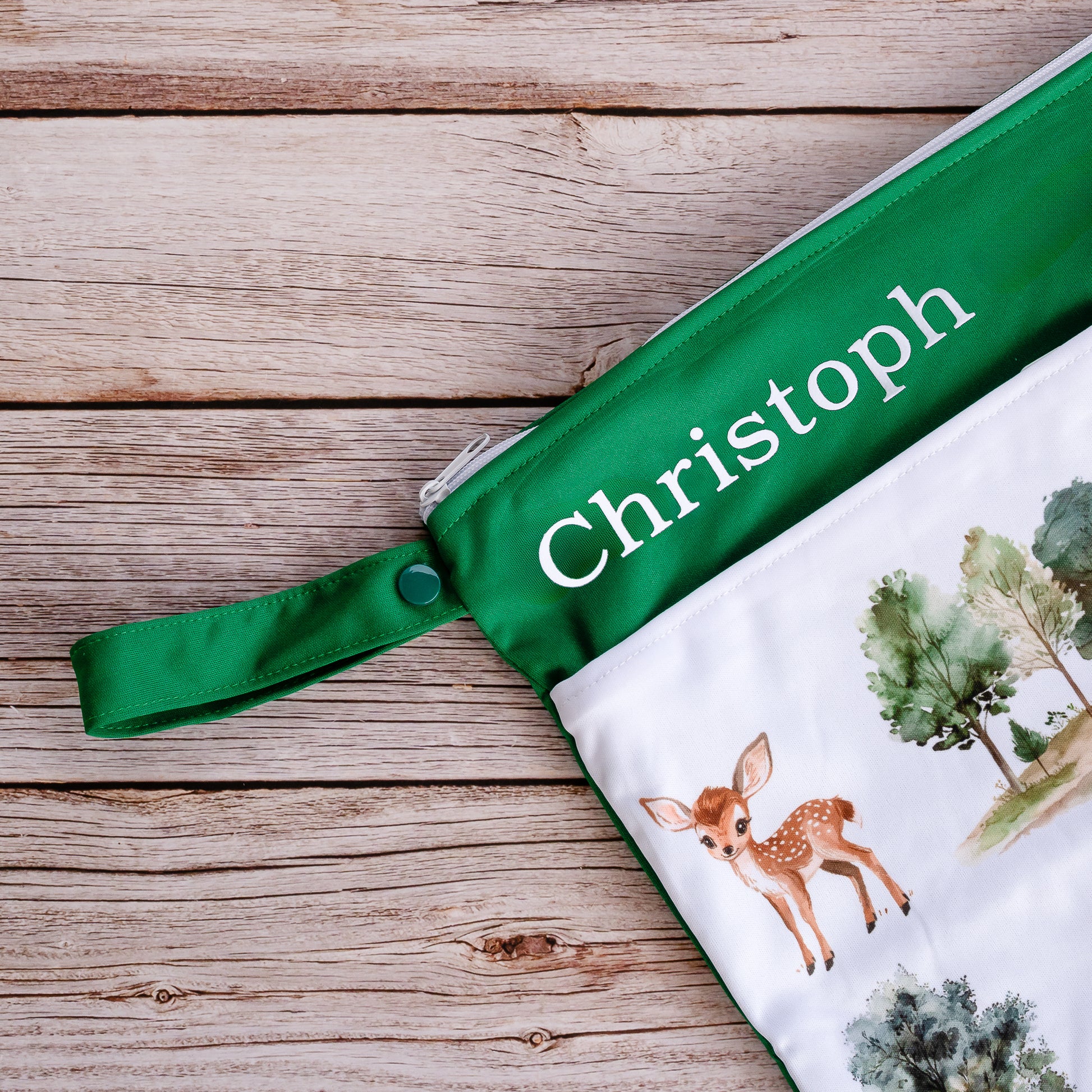 Das Besondere an diesem Modell sind zwei stabile Henkel an der Oberseite der Nasstasche. Mit den Henkeln kann die Nasstacshe bequem an einem Haken oder einem Türgriff aufgehangen werden - zum Beispiel in der Nähe des Wickeltischs. Natürlich dienen sie auch zum Tragen der Tasche.