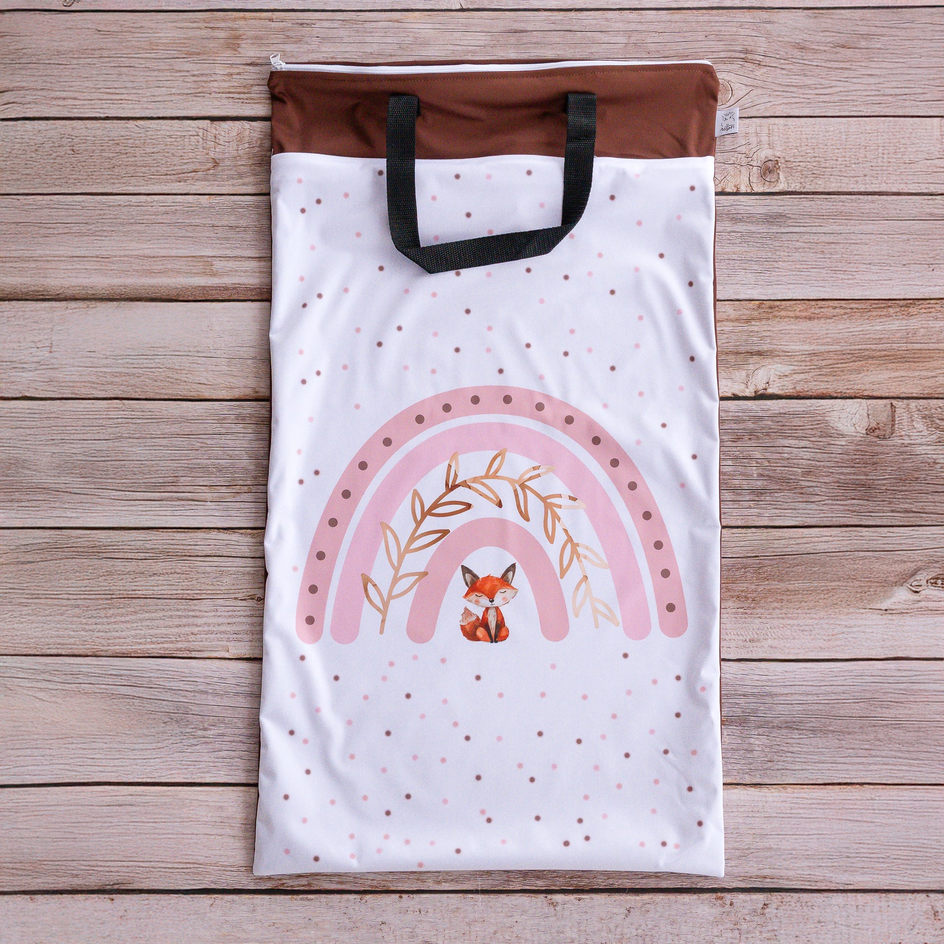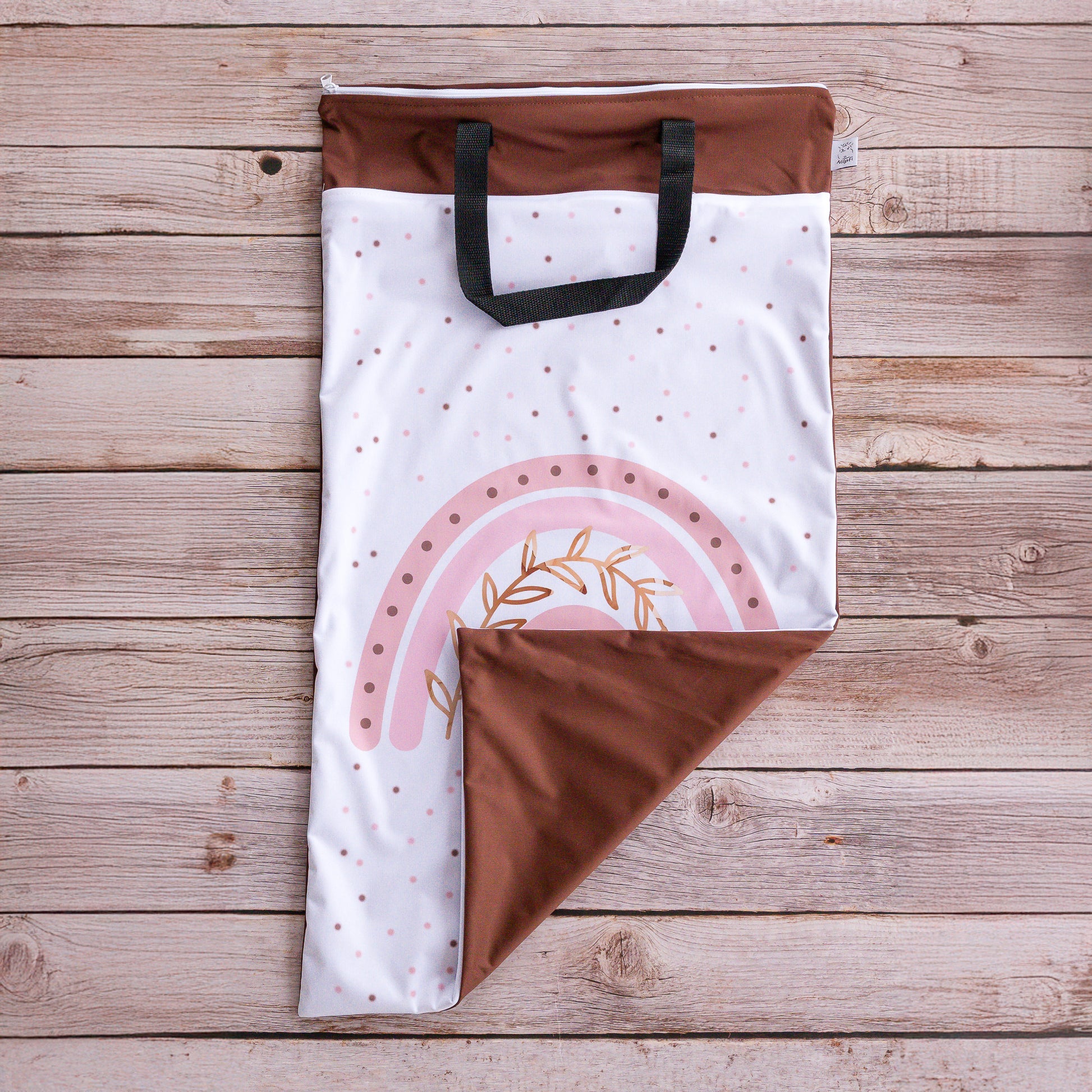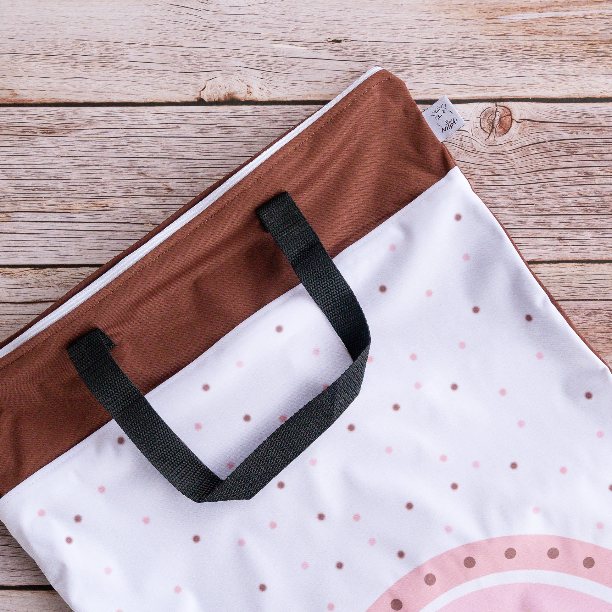 Das Besondere an diesem Modell sind zwei stabile Henkel an der Oberseite der Nasstasche. Mit den Henkeln kann die Nasstacshe bequem an einem Haken oder einem Türgriff aufgehangen werden - zum Beispiel in der Nähe des Wickeltischs. Natürlich dienen sie auch zum Tragen der Tasche.