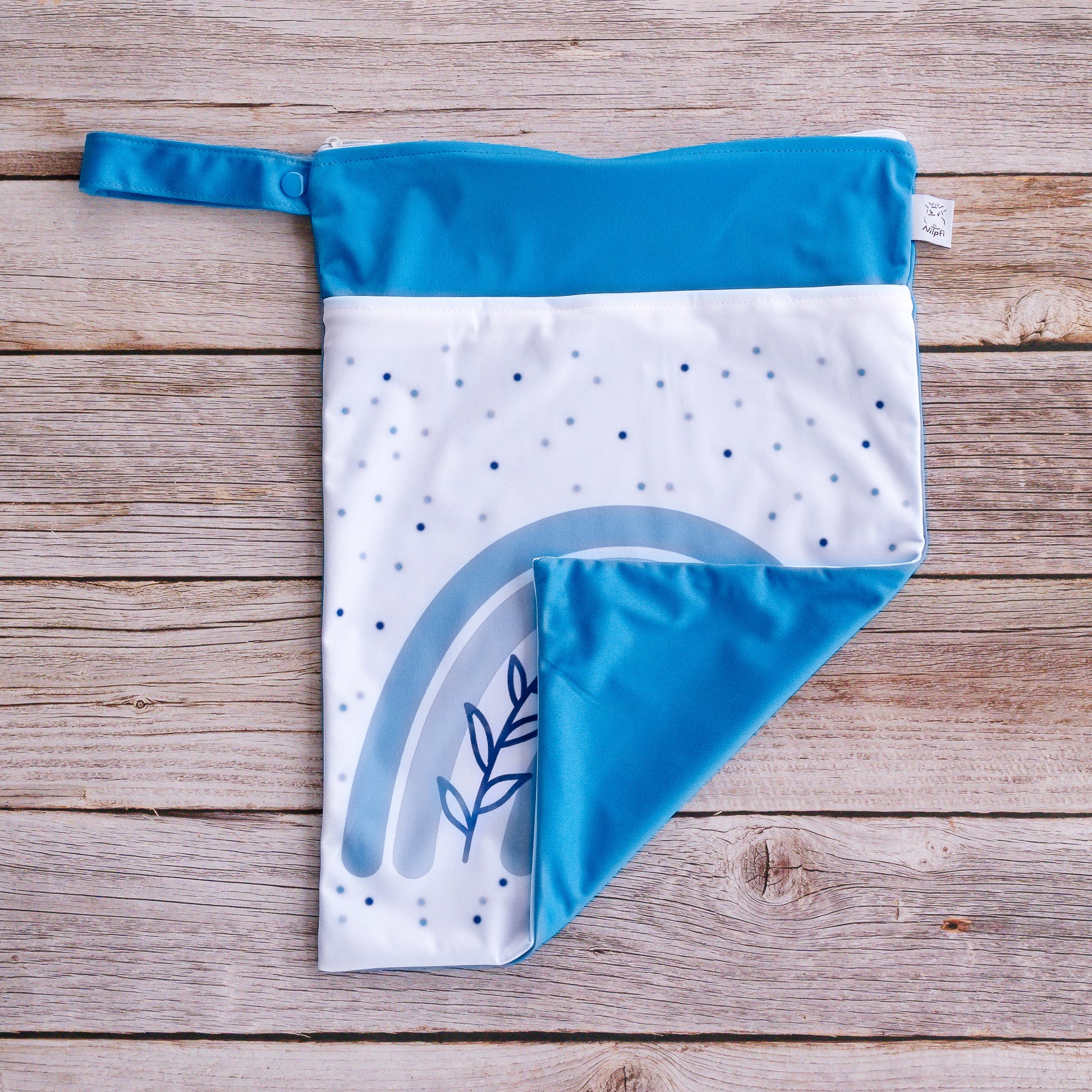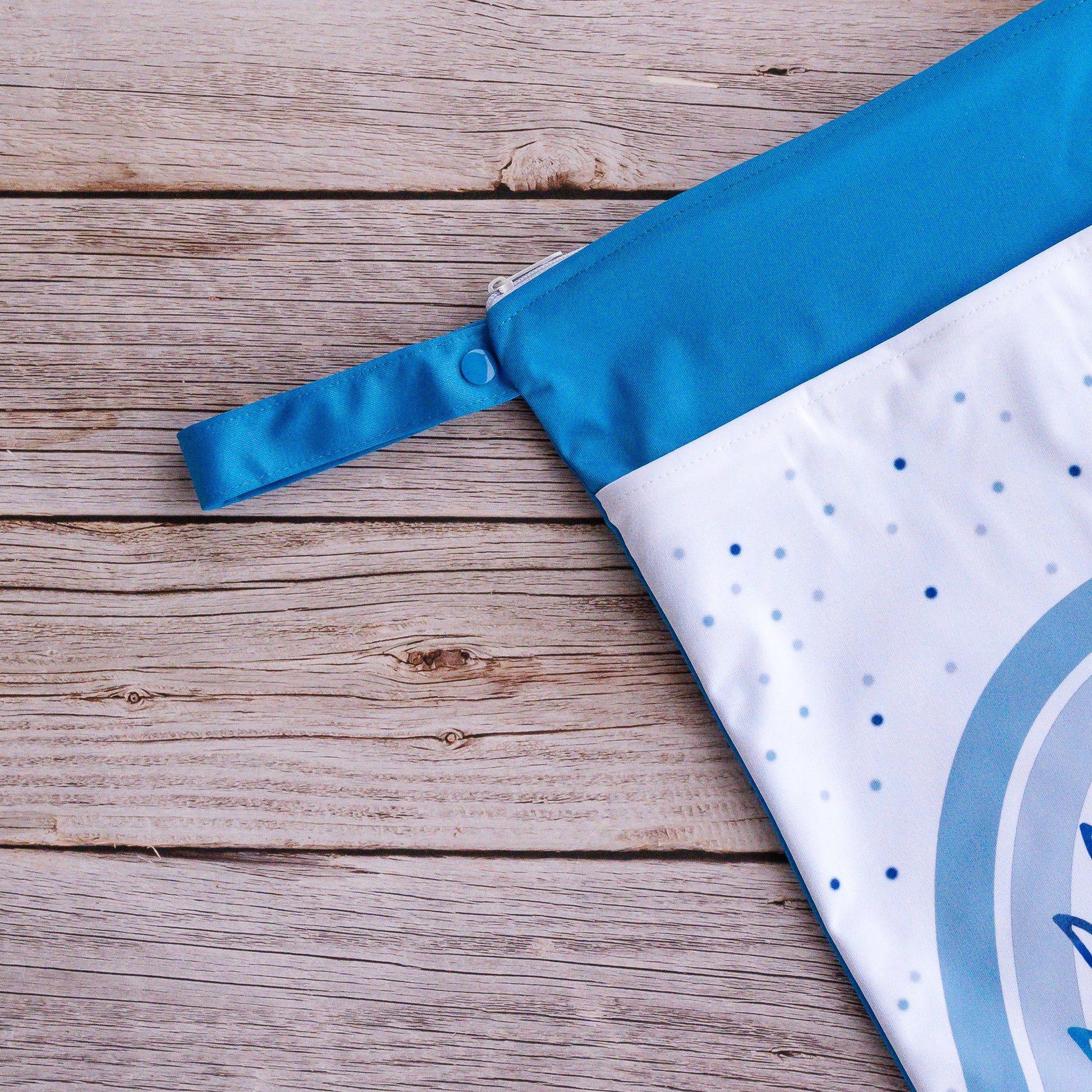 Das Besondere an diesem Modell sind zwei stabile Henkel an der Oberseite der Nasstasche. Mit den Henkeln kann die Nasstacshe bequem an einem Haken oder einem Türgriff aufgehangen werden - zum Beispiel in der Nähe des Wickeltischs. Natürlich dienen sie auch zum Tragen der Tasche.
